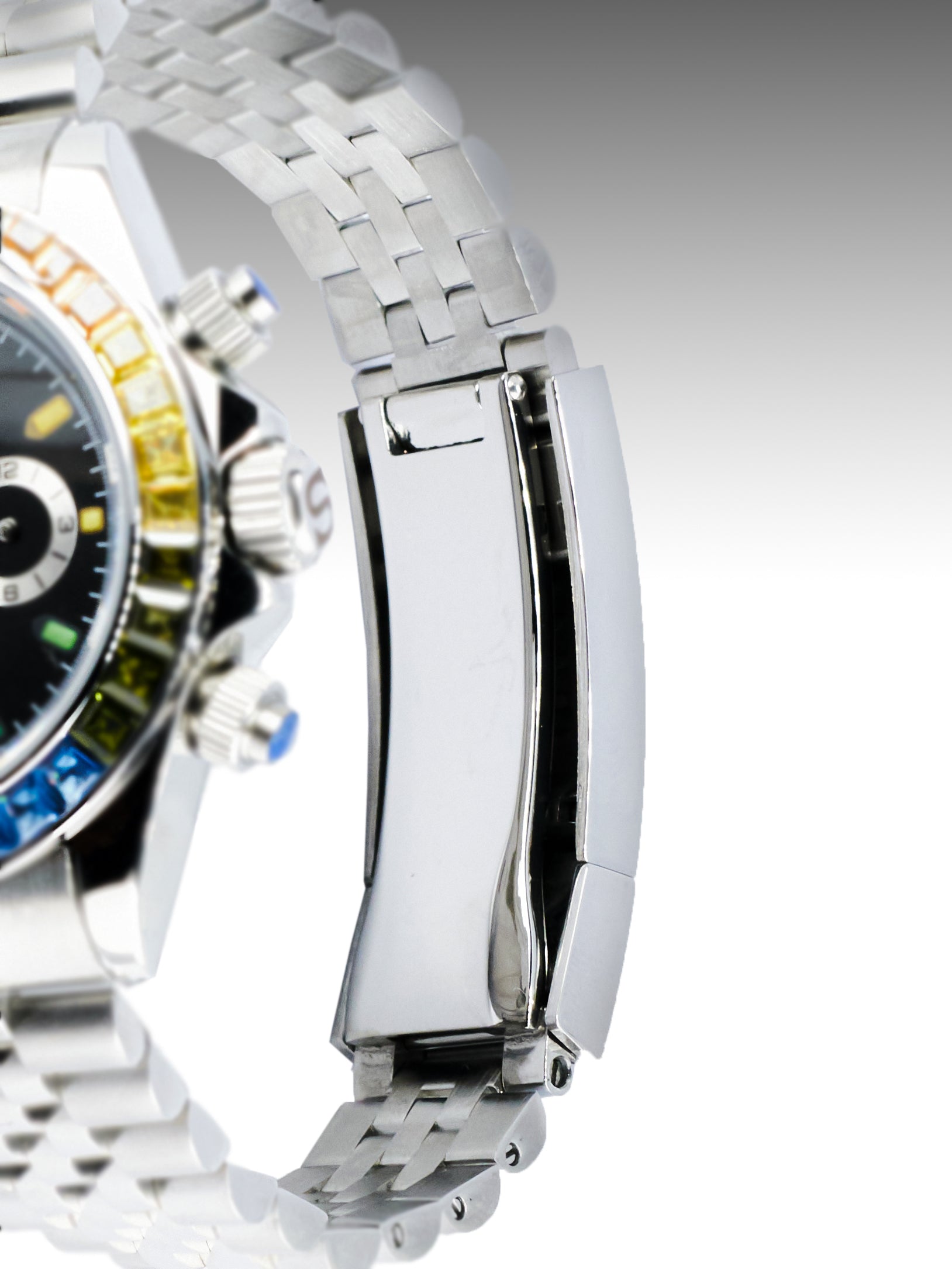Designed with sophistication in mind, the Daytona  Rainbow features a unique black dial and a robust stainless steel construction. Driven by a VK63 Mecaquartz Japan, this timepiece is ready for any occasion.
