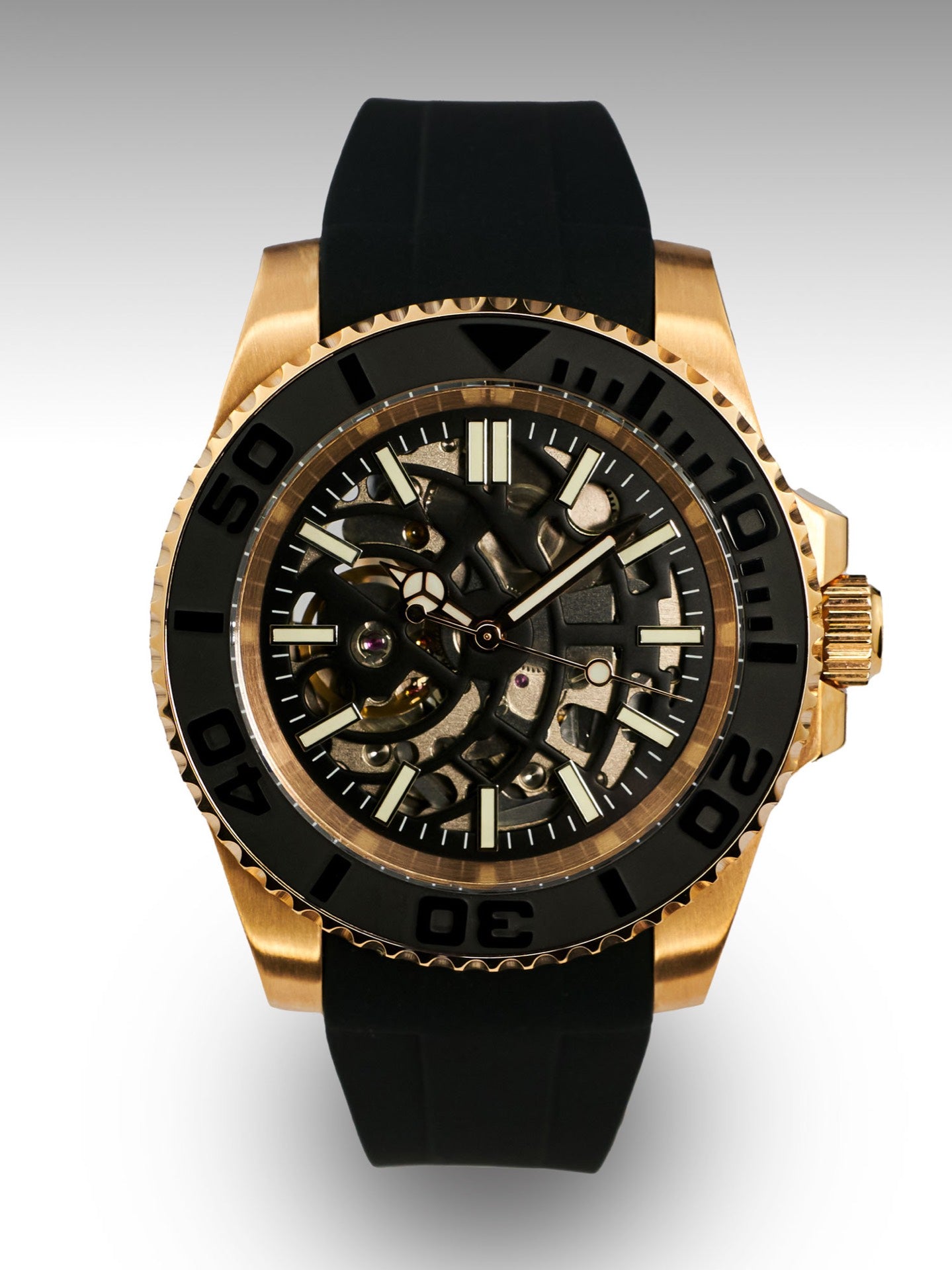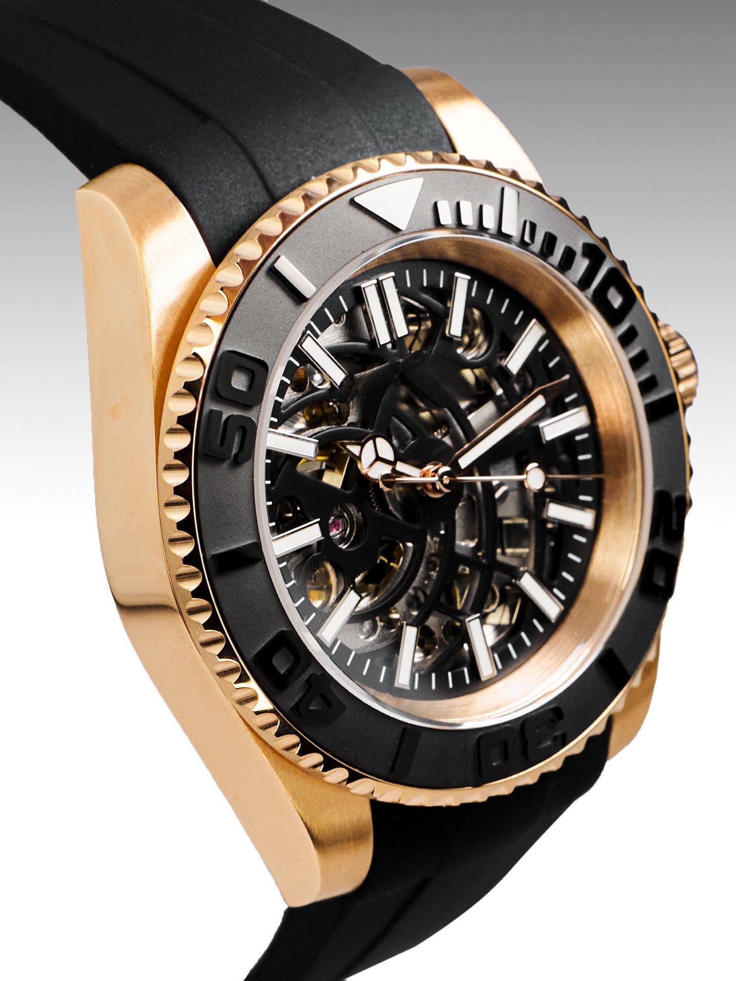 Elevate your wrist game with the Yacht master Gold | a celebration of craftsmanship. The black full skeleton dial catches the eye, while its stainless steel - gold body and sapphire crystal finish offer durability. Ideal for daily wear, the black fkm rubber makes it comfortable and classy.