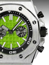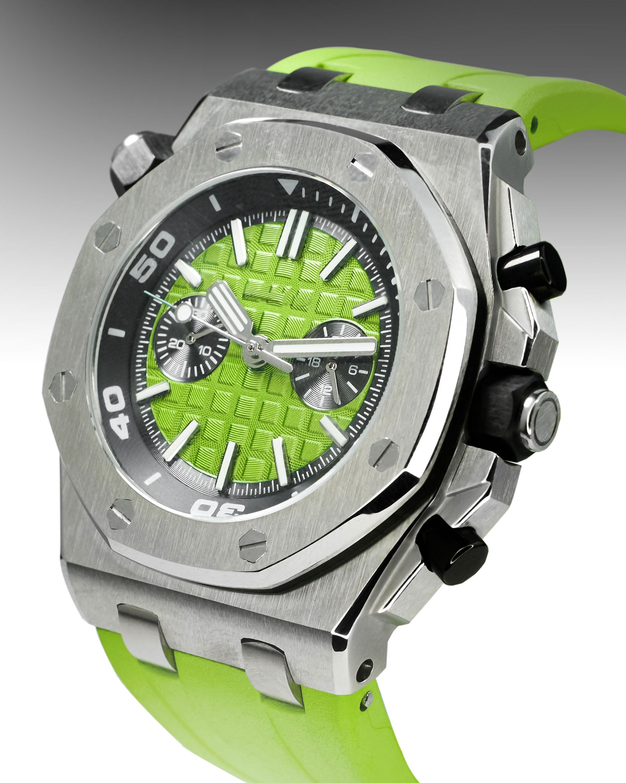 The Offshore Green blends classic watchmaking with a bold personality. Its green dial is a statement piece, protected by sapphire crystal, all housed in a 44 mm excluding crown stainless steel case. The green fkm rubber ensures a secure and elegant fit, while the VK64 Mechaquartz Japan powers it with precision.
