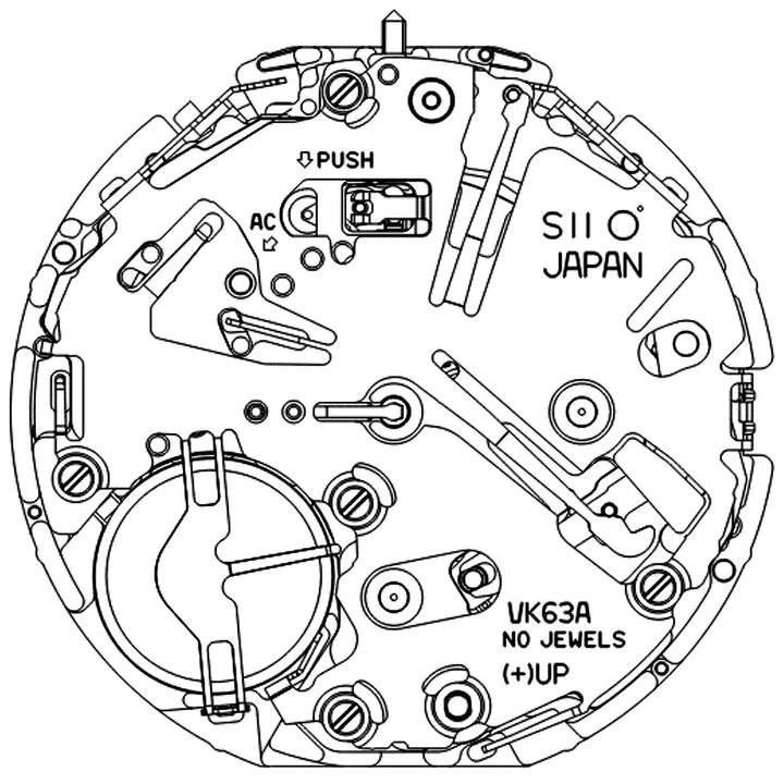 The SII (Seiko Instruments) caliber VK63 belongs to the category of hybrid mechanical quartz (mechaquartz) movements. This chronograph movement integrates quartz technology for fundamental watch functions while utilizing a mechanical module to operate the chronograph. Sometimes referenced as VK67 and VK83, they share the same base movement as VK63.
