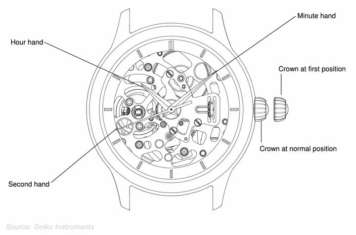 Time Module specifies an accuracy range of -20~+40 seconds per day for the NH72A under normal conditions. Similar to other NH movements, the NH72A is hackable and hand-windable, boasting three crown positions. It features hacking functionality, halting the second hand in time setting mode. The movement should be fully wound after approximately 55 manual turns of the crown, benefiting from the Seiko Magic Lever for prompt initiation.