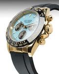 Elevate your wrist game with the Latest Daytona Gold | a celebration of craftsmanship. The Tiffany Blue dial catches the eye, while its stainless steel - gold body and sapphire crystal finish offer durability. Ideal for daily wear, the black rubber makes it comfortable and classy.